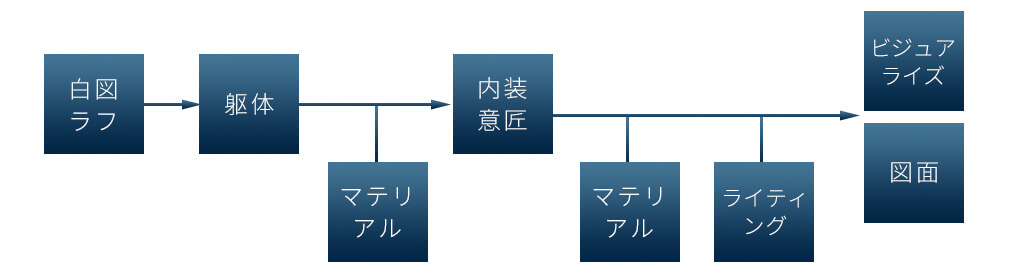 その後、デザインのご指示をいただき次第、内装のマテリアル反映やライティングの作業を進め、最終的にビジュアライズや図面化へ進んでいくという流れとなります。