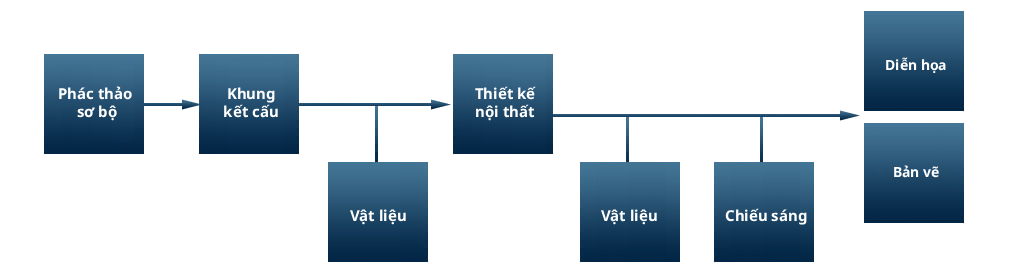 Tiếp theo, khi nhận được chỉ dẫn về thiết kế, chúng tôi sẽ tiến hành phản ánh vật liệu nội thất, thiết lập ánh sáng, và cuối cùng là triển khai đến giai đoạn trực quan hóa (visualization) hoặc xuất bản vẽ.
